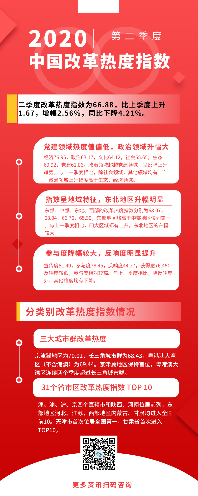 7月21日,中國經(jīng)濟(jì)體制改革研究會在京發(fā)布《2020年第二季度改革熱度第三方評估報告》。報告顯示,2020年第二季度改革熱度指數(shù)為66.88,比上季度上升1.67,增幅2.56%。