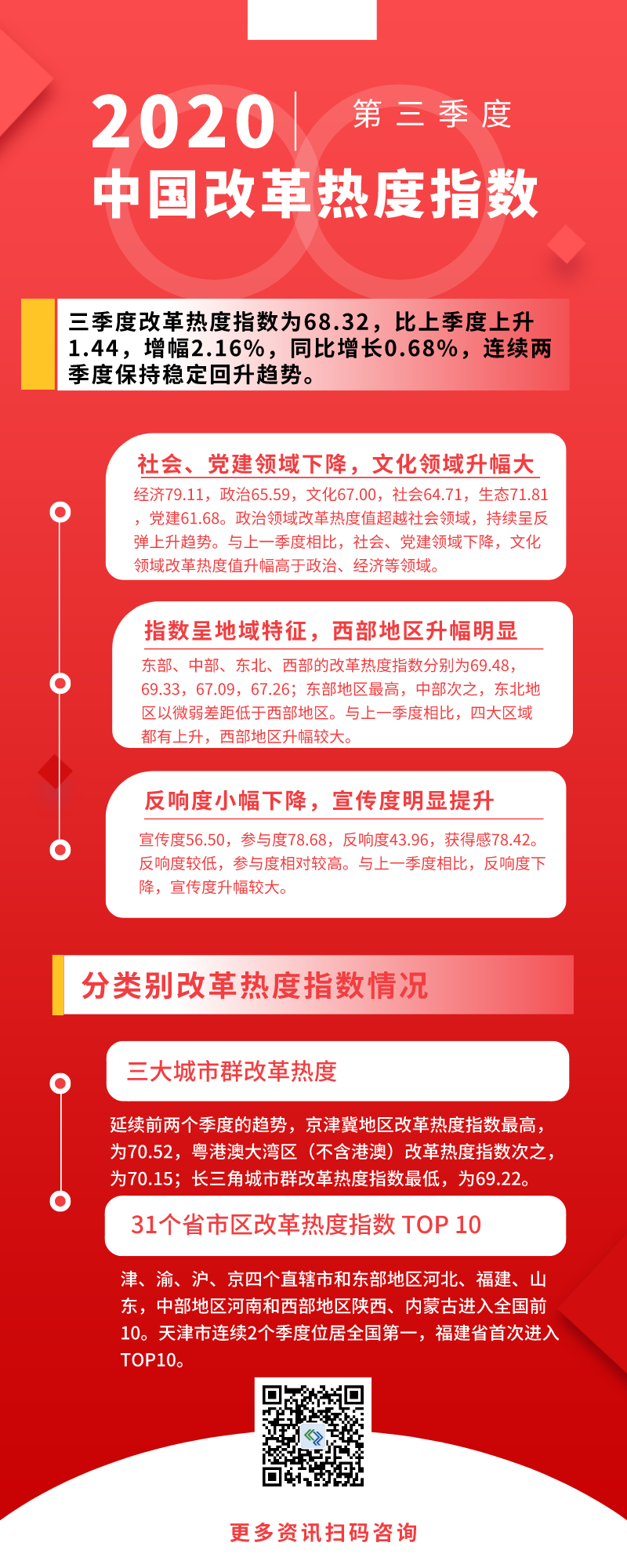 2018年11月25日,中國經(jīng)濟(jì)體制改革研究會在“第十六屆中國改革論壇”上首次發(fā)布《改革熱度指數(shù)——中國改革熱度第三方評估報(bào)告》,發(fā)布內(nèi)容為2018年第三季度中國改革熱度指數(shù),具體包括我國整體指數(shù)以及分省、分地區(qū)、分城市、分領(lǐng)域、分維度指數(shù),并將改革熱度指數(shù)總體報(bào)告呈送中央深改委,同時(shí)向各省深改委,以及有需求的城市改革辦提供各自熱度指數(shù)詳情報(bào)告。