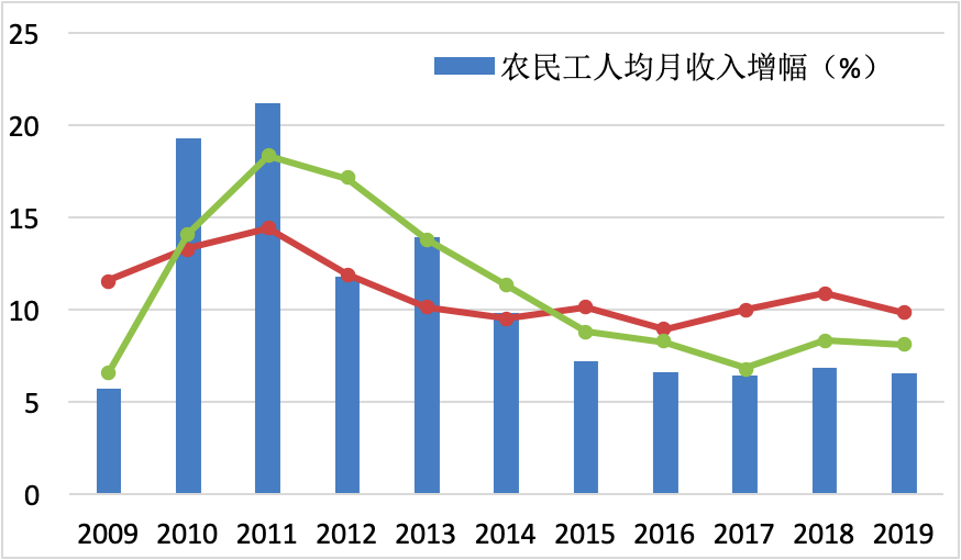 農(nóng)民工工資在2010年前后曾有過(guò)較快的提高,主要得益于各地最低工資的調(diào)整。值得注意的是,農(nóng)民工工資收入相對(duì)增速2015年后開始下降。農(nóng)民工年平均收入2017年是城鎮(zhèn)非私營(yíng)單位職工平均收入的56%,2019年下降為52.5%。