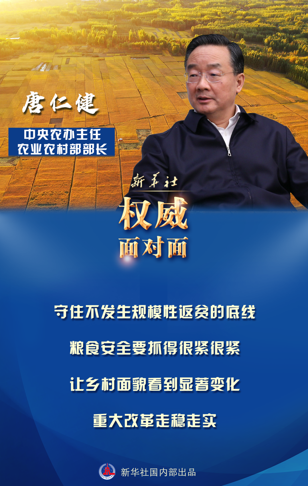 唐仁健:今年的中央一號文件,立足當前,突出年度性、時效性,部署今年必須完成的任務;又兼顧長遠,著眼“十四五”開局,突出戰(zhàn)略性、方向性,明確“十四五”時期的工作思路和重點舉措。
