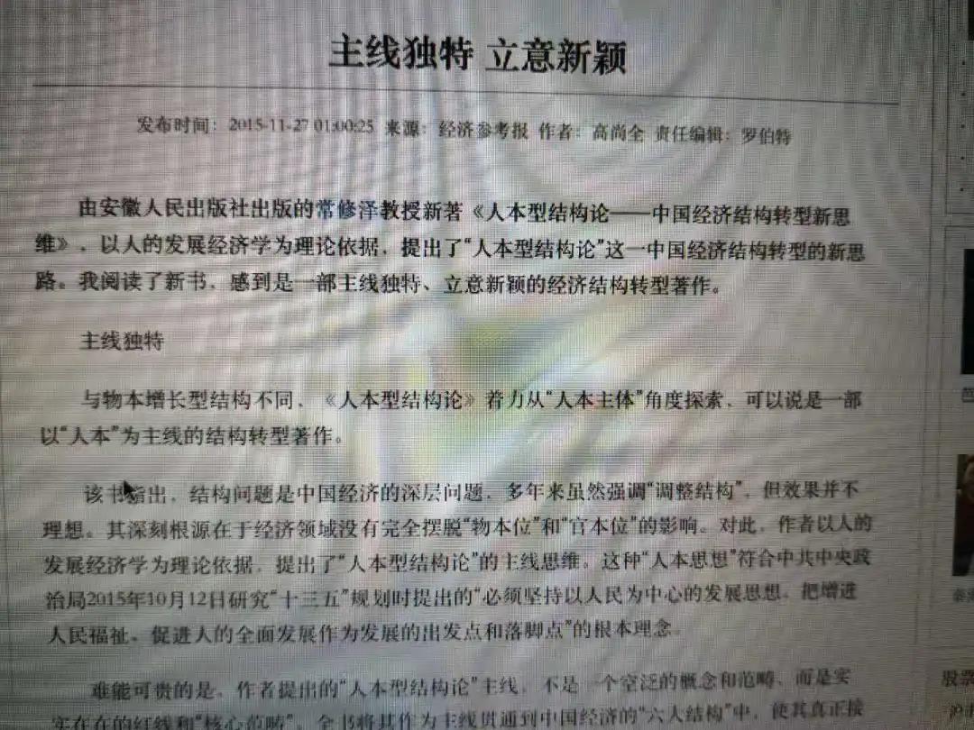 七年后,2008年,人本經(jīng)濟(jì)學(xué)研究成果專著之一《人本體制論——中國人的發(fā)展及體制安排研究》出版。又過七年,2015年,人本經(jīng)濟(jì)學(xué)研究成果專著之二《人本型結(jié)構(gòu)論——中國經(jīng)濟(jì)結(jié)構(gòu)轉(zhuǎn)型新思維》也出版問世。在書中,按照我的人本經(jīng)濟(jì)學(xué)理念,特別挖掘了馬克思在《政治經(jīng)濟(jì)學(xué)批判導(dǎo)言》中關(guān)于“人”是主人、“品”是“仆役”的思想,試圖與傳統(tǒng)的“物本經(jīng)濟(jì)學(xué)”和“權(quán)本經(jīng)濟(jì)學(xué)”“ 劃清界限。我沒有忘記:出版后,您在《經(jīng)濟(jì)參考報》撰文給予支持,題目雖然只有八個字:“主線獨特.立意新穎”,但觀點鮮明,呵護(hù)有加,頗感溫暖(見高尚全:《主線獨特.立意新穎》,《經(jīng)濟(jì)參考報》2015年12月1日)。