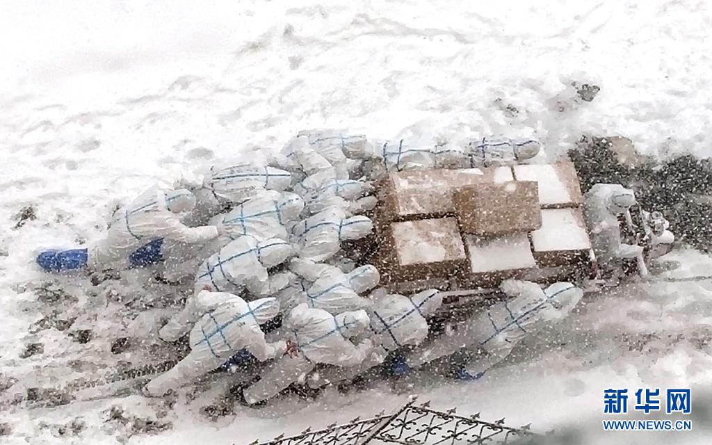 漫天飛雪的路上,十幾個人推著一輛滿載貨物的三輪車艱難前行,數(shù)次滑倒又爬起后,身上的防護服仿佛與天地融為一體……