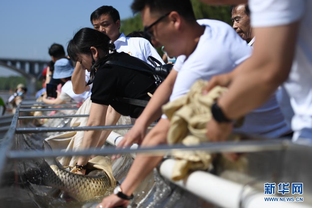 2021年6月6日,市民在湖南長沙橘子洲公園參與放魚活動。新華社記者 薛宇舸 攝