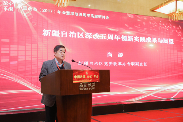 新疆自治區(qū)黨委改革辦專職副主任尚游介紹了新疆的特色改革領(lǐng)域:在機(jī)構(gòu)設(shè)置上,針對(duì)新疆穩(wěn)定問題設(shè)立社會(huì)治理體制改革專項(xiàng)小組;多措并舉推進(jìn)民族團(tuán)結(jié),建立了民族團(tuán)結(jié)一家親長效機(jī)制,豐富了民族團(tuán)結(jié)的載體和平臺(tái);創(chuàng)新宗教事務(wù)教育管理服務(wù)辦法,積極推進(jìn)央企屬地建設(shè);探索政府主導(dǎo)轉(zhuǎn)移就業(yè)模式;大力推進(jìn)鄉(xiāng)鎮(zhèn)站所管理體制改革。