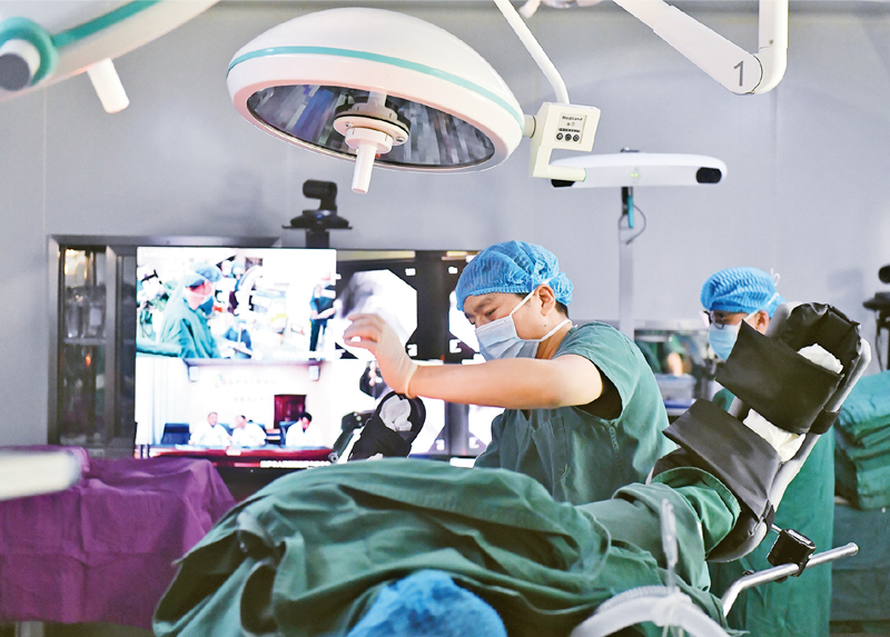 數(shù)字技術(shù)與醫(yī)療、農(nóng)業(yè)、能源、建筑、服務(wù)業(yè)等緊密結(jié)合,正在推動傳統(tǒng)產(chǎn)業(yè)日益高端化、智能化。圖為2021年4月19日,拉薩市人民醫(yī)院骨科醫(yī)生在北京積水潭醫(yī)院專家遠(yuǎn)程指導(dǎo)下,使用骨科機(jī)器人開展骨科手術(shù)?!⌒氯A社記者 孫瑞博 /攝