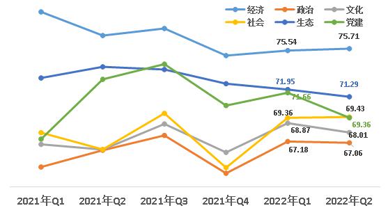 1、經(jīng)濟(jì)、社會領(lǐng)域小幅上升。從六大領(lǐng)域來看,經(jīng)濟(jì)領(lǐng)域得分75.71,政治領(lǐng)域得分67.06 ,文化領(lǐng)域得分68.01,社會領(lǐng)域得分69.43,生態(tài)領(lǐng)域得分71.29,黨建領(lǐng)域得分69.36。與上一季度相比,經(jīng)濟(jì)、社會領(lǐng)域小幅上升,其他領(lǐng)域均下降。其中黨建領(lǐng)域降幅最大,下降2.3。