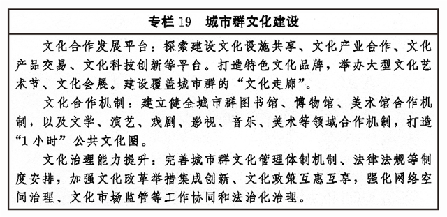 加強(qiáng)區(qū)域文化協(xié)同創(chuàng)新,健全合作互助、扶持補(bǔ)償機(jī)制,推動(dòng)?xùn)|部地區(qū)以創(chuàng)新引領(lǐng)文化發(fā)展,加大力度支持中西部地區(qū)以及東北等老工業(yè)基地文化發(fā)展,扶持革命老區(qū)、民族地區(qū)、邊疆地區(qū)文化發(fā)展,形成相互促進(jìn)、優(yōu)勢(shì)互補(bǔ)、融合互動(dòng)的區(qū)域文化發(fā)展格局。圍繞京津冀協(xié)同發(fā)展、長(zhǎng)江經(jīng)濟(jì)帶發(fā)展、粵港澳大灣區(qū)建設(shè)、長(zhǎng)三角一體化發(fā)展、黃河流域生態(tài)保護(hù)和高質(zhì)量發(fā)展等區(qū)域重大戰(zhàn)略,健全推進(jìn)區(qū)域內(nèi)文化協(xié)同發(fā)展機(jī)制,提升公共文化設(shè)施互聯(lián)互通水平,加強(qiáng)區(qū)域文化產(chǎn)業(yè)帶建設(shè),實(shí)現(xiàn)區(qū)域文化建設(shè)水平整體提高。促進(jìn)形成文化產(chǎn)業(yè)發(fā)展新格局,創(chuàng)新城市群文化一體化發(fā)展體制機(jī)制,共建高水平合作平臺(tái),加強(qiáng)公共文化服務(wù)便利共享。完善以城帶鄉(xiāng)、城鄉(xiāng)融合的文化發(fā)展體制機(jī)制,發(fā)揮城市帶動(dòng)輻射作用,加快城鄉(xiāng)間文化要素雙向流動(dòng),形成以點(diǎn)帶面、特色鮮明、優(yōu)勢(shì)互補(bǔ)、均衡配置的城鄉(xiāng)文化發(fā)展新格局。