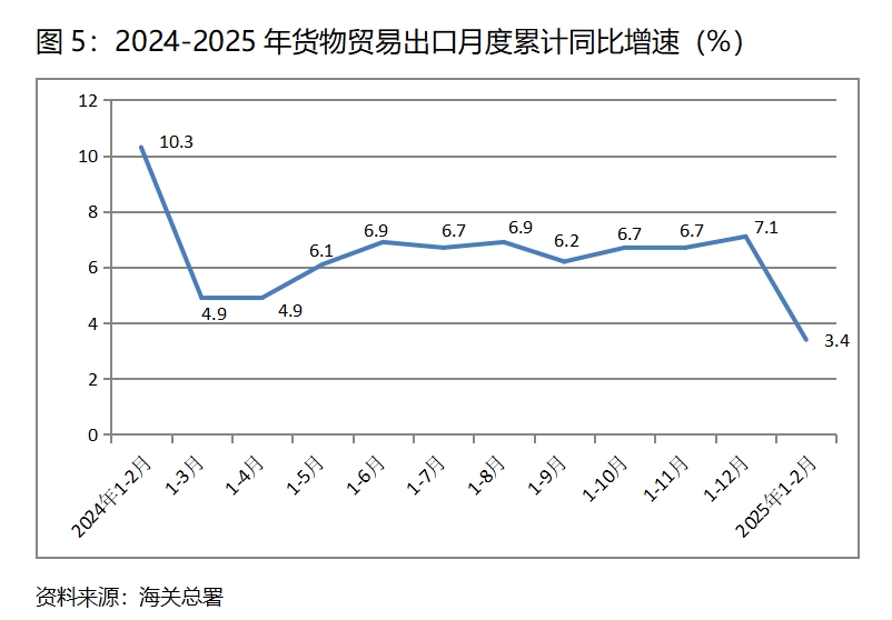 (二)貨物出口增速由升轉(zhuǎn)落。1-2月份,貨物出口同比增長3.4%,比上年1-12月份增長7.1%回落3.7個百分點,1-12月份比1-11月份回升0.4個百分點,呈現(xiàn)出增速由升轉(zhuǎn)落的態(tài)勢。貨物出口對主要貿(mào)易出口經(jīng)濟體增速全面回落,1-2月份對歐盟出口增長1.8%,比上年1-12月月份回落2.5個百分點;對美國出口增長3.4%,比1-12月份回落2.7個百分點;對東盟出口增長6.8%,比1-12月份回落6.6個百分點;對拉丁美洲出口增長4.4%,比1-12月份回落10.0個百分點。