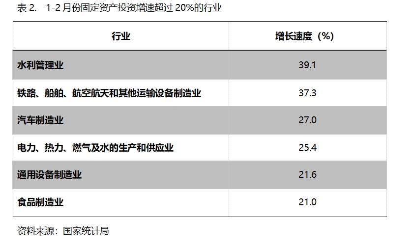 1-2月份,固定資產(chǎn)投資增速超過20%的主要行業(yè)共6個,即水利管理業(yè)增長39.1%,鐵路、船舶、航空航天和其他運輸設(shè)備制造業(yè)增長37.3%,汽車制造業(yè)增長27.0%,電力、熱力、燃氣及水的生產(chǎn)和供應(yīng)業(yè)增長25.4%,通用設(shè)備制造業(yè)增長21.6%,食品制造業(yè)增長21.0%。