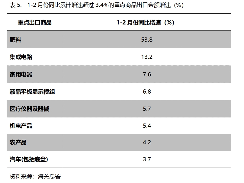 1-2月份,出口金額同比增速超過3.4%的重點商品共有8類,即肥料出口增長53.8%,集成電路增長13.2%,家用電器增長7.6%,液晶平板顯示模組增長6.8%,醫(yī)療儀器及器械增長5.7%,機電產(chǎn)品增長5.4%,農(nóng)產(chǎn)品增長4.2%,汽車(包括底盤)增長3.7%。