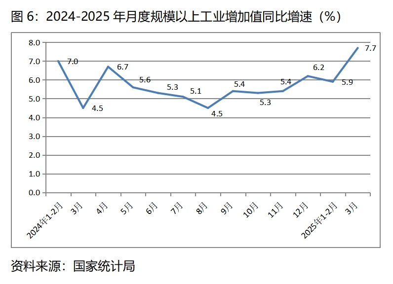 (一)工業(yè)生產(chǎn)增速比上年全年和上年同期均保持回升。一季度規(guī)模以上工業(yè)增加值同比增長(zhǎng)6.5%,比上年全年增長(zhǎng)5.8%回升0.7個(gè)百分點(diǎn),比上年同期增長(zhǎng)6.1%回升0.4個(gè)百分點(diǎn)。其中,3月份規(guī)模以上工業(yè)生產(chǎn)增長(zhǎng)7.7%,不僅比1-2月份增速有明顯的回升,而且也是近幾年以來(lái)月度規(guī)模以上工業(yè)生產(chǎn)增長(zhǎng)最快的一個(gè)月份。