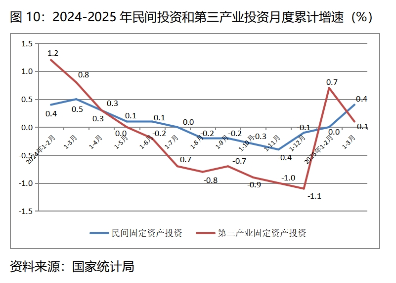 (一)民間投資和第三產(chǎn)業(yè)投資增長(zhǎng)仍比較緩慢,增速比上年全年和上年同期均變化不大。一季度民間固定資產(chǎn)投資同比增長(zhǎng)0.4%,上年全年為下降0.1%,比上年同期增長(zhǎng)0.5%回落0.1個(gè)百分點(diǎn);一季度第三產(chǎn)業(yè)固定資產(chǎn)投資同比增長(zhǎng)0.1%,上年全年為下降1.1%,比上年同期增長(zhǎng)0.8%回落0.7個(gè)百分點(diǎn)。這說(shuō)明民營(yíng)經(jīng)濟(jì)和第三產(chǎn)業(yè)生產(chǎn)經(jīng)營(yíng)活力還比較弱。