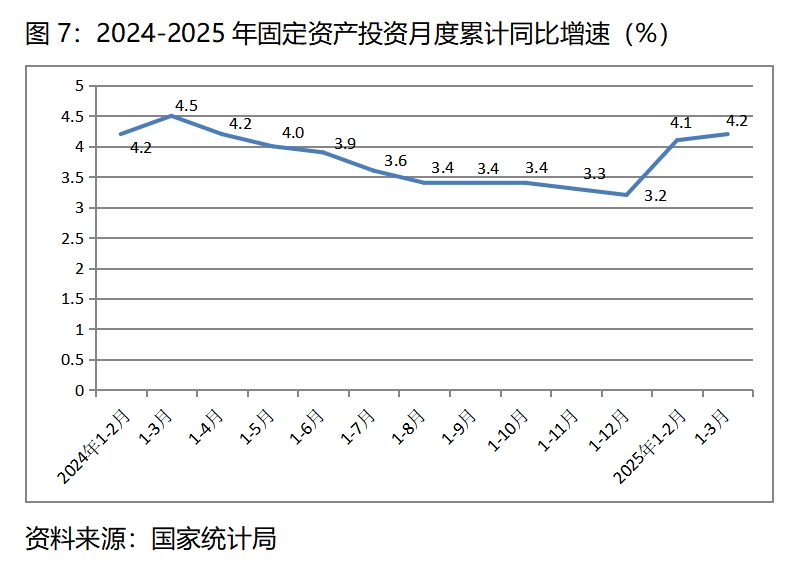 (二)固定資產(chǎn)投資增速比上年全年回升,比上年同期略有回落。一季度固定資產(chǎn)投資(不含農(nóng)戶)同比增長(zhǎng)4.2%,比上年全年增長(zhǎng)3.2%回升1.0個(gè)百分點(diǎn),比上年同期增長(zhǎng)4.5%回落0.3個(gè)百分點(diǎn)。與上年同期比,第一產(chǎn)業(yè)投資增速回升明顯,同比增長(zhǎng)16.0%,比上年同期回升15.0個(gè)百分點(diǎn);第二產(chǎn)業(yè)投資略有回落,同比增長(zhǎng)11.9%,比上年同期回落1.5個(gè)百分點(diǎn);第三產(chǎn)業(yè)繼續(xù)保持低速增長(zhǎng),同比增長(zhǎng)0.1%,比上年同期回落0.7個(gè)百分點(diǎn)。