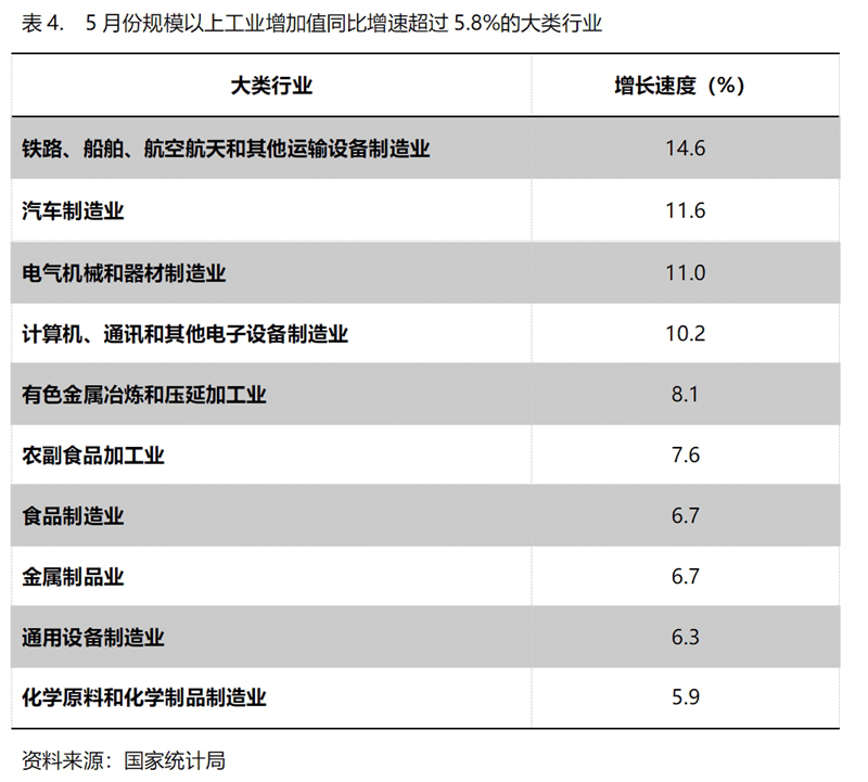 5月份,增長速度超過規(guī)模以上工業(yè)增長5.8%的主要大類行業(yè)共有10個,即鐵路、船舶、航空航天和其他運(yùn)輸設(shè)備制造業(yè)增長14.6%,汽車制造業(yè)增長11.6%,電氣機(jī)械和器材制造業(yè)增長11.0%,計算機(jī)、通訊和其他電子設(shè)備制造業(yè)增長10.2%,有色金屬冶煉和壓延加工業(yè)增長8.1%,農(nóng)副食品加工業(yè)增長7.6%,食品制造業(yè)增長6.7%,金屬制品業(yè)增長6.7%,通用設(shè)備制造業(yè)增長6.3%,化學(xué)原料和化學(xué)制品制造業(yè)增長5.9%。