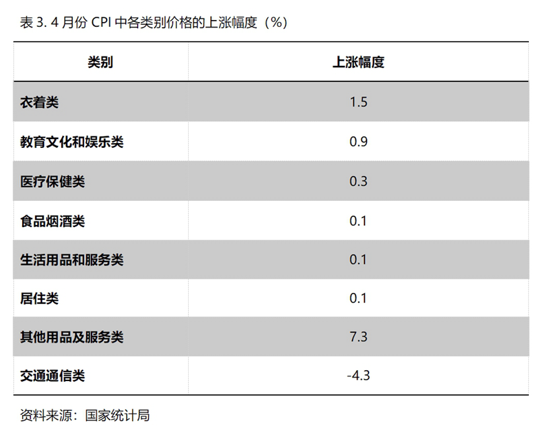5月份,在CPI 8個類別中有7個類別保持上漲,1個類別下降。上漲的7個類別包括衣著類價格同比上漲1.5%,教育文化和娛樂類上漲0.9%,醫(yī)療保健類上漲0.3%,食品煙酒類上漲0.1%,生活用品及服務(wù)類上漲0.1%,居住類上漲0.1%,其他用品和服務(wù)類上漲7.3%;下降的雖然就交通通信類1個類別,但降幅較大,5月份同比下降4.3%。