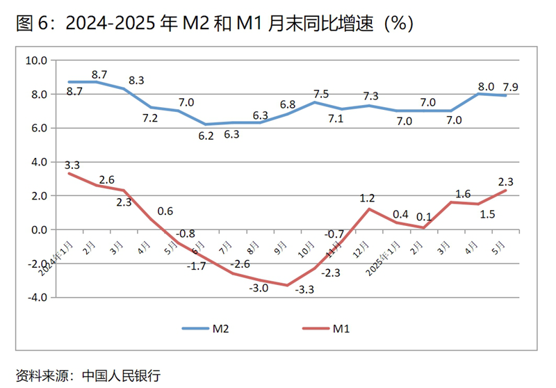 (六)M2增速由升轉(zhuǎn)落。5月末,廣義貨幣供應(yīng)量(M2)同比增長7.9%,比4月末增長8.0%回落0.1個百分點,基本保持了上月末的增速;狹義貨幣供應(yīng)量(M1)增速比上月有所回升,5月末同比增長2.3%,比4月末增長1.5%回升0.8個百分點,而4月末增幅比3月末增幅回落0.1個百分點;流通中貨幣(M0)增速持續(xù)回升,5月末同比增長12.1%,比4月末增長12.0%回升0.1個百分點,而4月末增速比3月末增速回升0.5個百分點。5月末M2增速與上月增速基本持平,M1和M0增速回升,表明貨幣政策仍在向適度寬松方向的要求運(yùn)行,但需要關(guān)注的還是M1增速仍還比較緩慢。