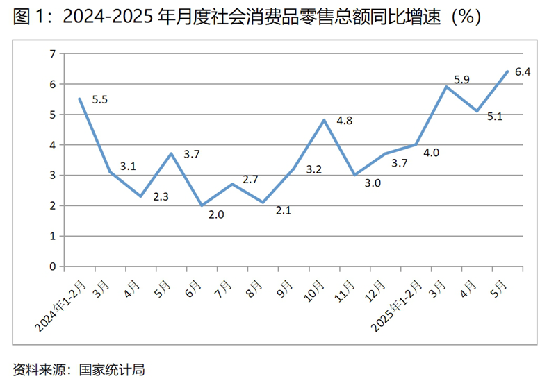 (一)零售增速由落轉(zhuǎn)升。5月份,社會消費(fèi)品零售總額同比增長6.4%,比4月份增長5.1%回升了1.3個百分點,4月份比3月份增長5.8%回落了0.7個百分點,社會消費(fèi)品零售總額增速由上月回落轉(zhuǎn)為回升,為上年以來月度同比增速最快的月份。這是近一個時期特別是今年以來持續(xù)采取以舊換新等一系列擴(kuò)大消費(fèi)政策措施的結(jié)果,同時也說明只要采取積極有效的政策措施,是能夠取得一些領(lǐng)域持續(xù)回升的效果。