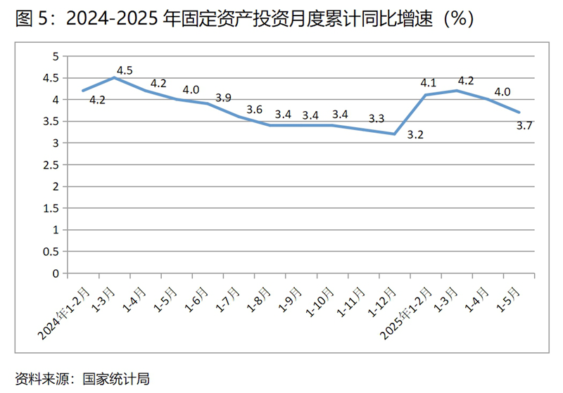 (五)投資增速持續(xù)回落。1-5月份,固定資產(chǎn)投資同比增長3.7%,比1-4月份增長4.0%回落了0.3個百分點,1-4月份增速比1-3月份增長4.2%回落了0.2個百分點,增速呈現(xiàn)出持續(xù)的回落。1-5月份國有控股投資同比增速比1-4月份回落0.3個百分點;民間投資回落了0.2個百分點。三次產(chǎn)業(yè)投資中,第一產(chǎn)業(yè)投資增速回落4.8個百分點,第二產(chǎn)業(yè)投資增速回落0.3個百分點,第三產(chǎn)業(yè)投資降幅擴(kuò)大0.2 百分點。民間投資和第三產(chǎn)業(yè)投資增長仍比較緩慢。