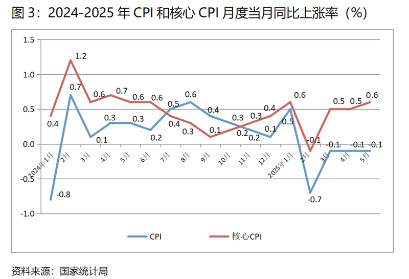 (三) CPI降幅持續(xù)持平。5月份,CPI同比下降0.1%,與4月份下降0.1%持平, CPI已連續(xù)4個月下降,連續(xù)3個月保持下降0.1%;5月份,核心CPI同比上漲0.6%,比4月份上漲0.5%上升了0.1個百分點。CPI保持持續(xù)下降的趨勢,有季節(jié)性食品和國際石油價格下降因素的影響,但核心CPI漲幅仍保持在低位運(yùn)行,說明需求特別是消費(fèi)需求仍還較為偏弱,擴(kuò)大需求特別是消費(fèi)需求還需要進(jìn)一步加大力度。