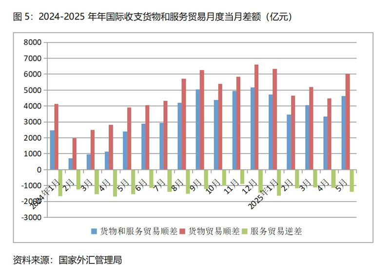 (四)國際收支貨物和服務(wù)貿(mào)易順差持續(xù)增加。今年1月份國際收支貨物和服務(wù)貿(mào)易順差比上年同月增加2252億元;2月份順差增加2735億元,3月順差增加3093億元,4月順差增加2199億元,5月順差增加2249億元,國際收支貨物和服務(wù)貿(mào)易順差比上年同期有著明顯的增加。在美國“對等關(guān)稅”政策的沖擊下,國際收支貨物和服務(wù)貿(mào)易仍實(shí)現(xiàn)較大的順差,足以說明我國經(jīng)濟(jì)有著較強(qiáng)的國際競爭力。