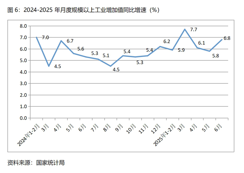(一)工業(yè)生產(chǎn)增速比一季度略有回落,比上年同期回升。 上半年規(guī)模以上工業(yè)增加值同比增長6.4%,比一季度增長6.5%回落了0.1個百分點(diǎn),比上年同期增長6.0%回升0.4個百分點(diǎn)。其中,采礦業(yè)同比增長6.0%,比一季度增長6.2%回落了0.2個百分點(diǎn);制造業(yè)增長7.0%,比一季度增長7.1%回落了0.1個百分點(diǎn);電力、熱力、燃?xì)饧八a(chǎn)和供應(yīng)業(yè)增長1.9%,與一季度持平。