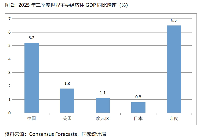 二季度5.2%的經(jīng)濟(jì)增速在世界上是比較快的增速。根據(jù)Consensus Forecasts 最新預(yù)測數(shù)據(jù),今年二季度美國GDP同比將增長1.8%,歐元區(qū)將增長1.1%,日本將增長0.8%,印度將增長6.5%,我國仍然是世界主要經(jīng)濟(jì)體中經(jīng)濟(jì)增長比較快的國家。