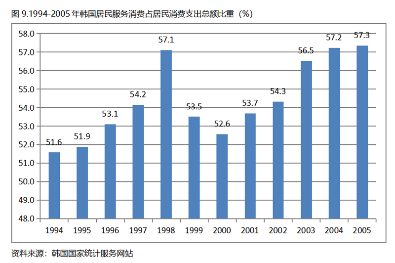 美國(guó)、日本和韓國(guó)在人均GDP超過(guò)1萬(wàn)美元后,居民服務(wù)消費(fèi)占居民消費(fèi)支出總額比重的持續(xù)提高,居民耐用品消費(fèi)和非耐用品消費(fèi)占居民消費(fèi)支出總額比重的總體下降,給出的一個(gè)重要啟示,就是提高居民消費(fèi)率要聚焦在居民服務(wù)消費(fèi)上發(fā)力。