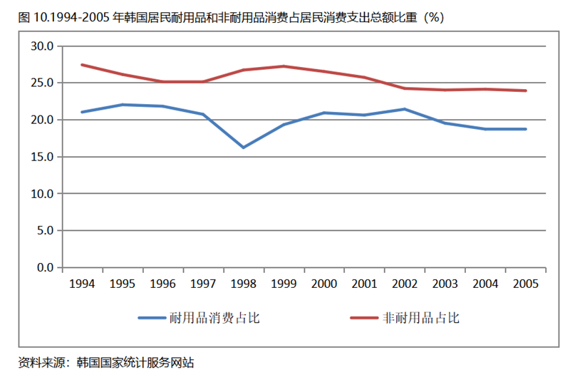韓國(guó)在人均GDP超過(guò)1萬(wàn)美元后的1994-2005年期間,居民服務(wù)消費(fèi)占居民消費(fèi)支出總額在波動(dòng)中提高,而居民耐用品消費(fèi)占居民消費(fèi)支出總額比重、非耐用品消費(fèi)占居民消費(fèi)支出總額比重要均呈現(xiàn)下降趨勢(shì)。