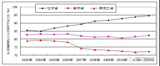 2011年,遼、吉、黑三省R&D經(jīng)費支出分別占地區(qū)生產(chǎn)總值的1.52%、1.23%和1.02%,均低于全國1.84%的平均值,占全國比重由2003年的9.16%下降到2011年的7.1%。